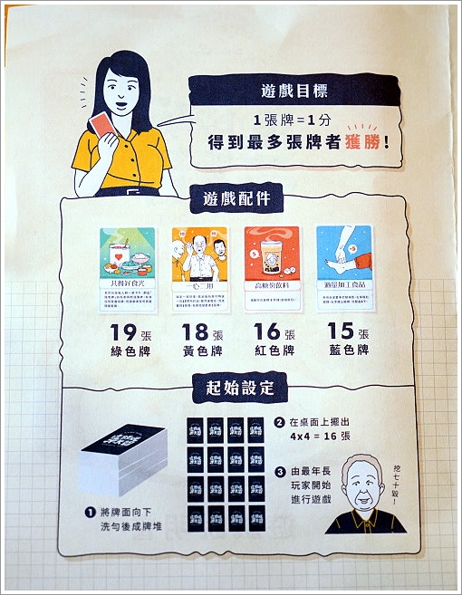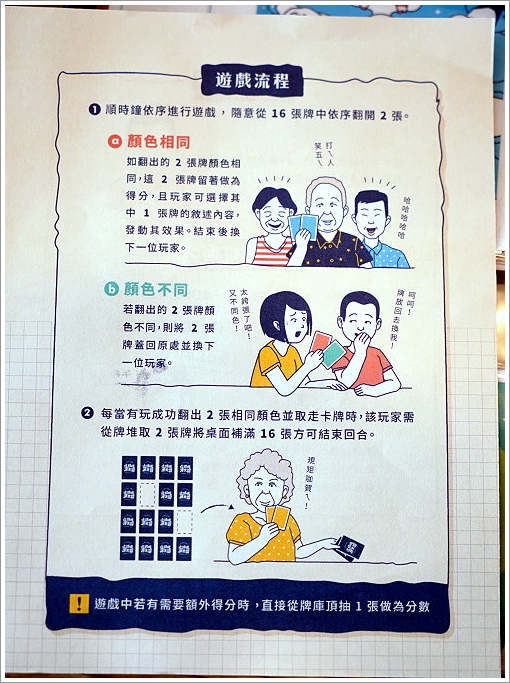 ▼遊戲目標就是得最多張牌的人就獲勝,所以大家想辦法拿到最多牌就對啦(笑)~一開始先將卡牌洗乾淨後,擺成4×4=16張的方式,由最年長的長輩開始抽牌!