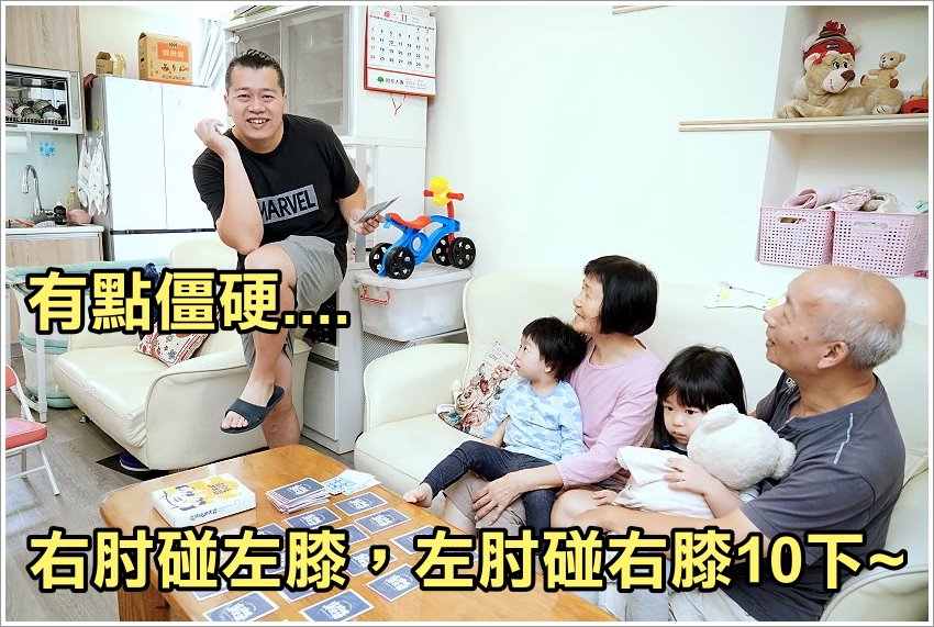 ▼除了有肢體運動之外,也有倒著念一句話、用另一種語言念出一段歌詞等不同的指令內容,讓長輩可以一次獲得腦動、身動、人際互動的活絡,更能有效減低失智症的發生率,而且也能樂在其中、增進親子感情唷!