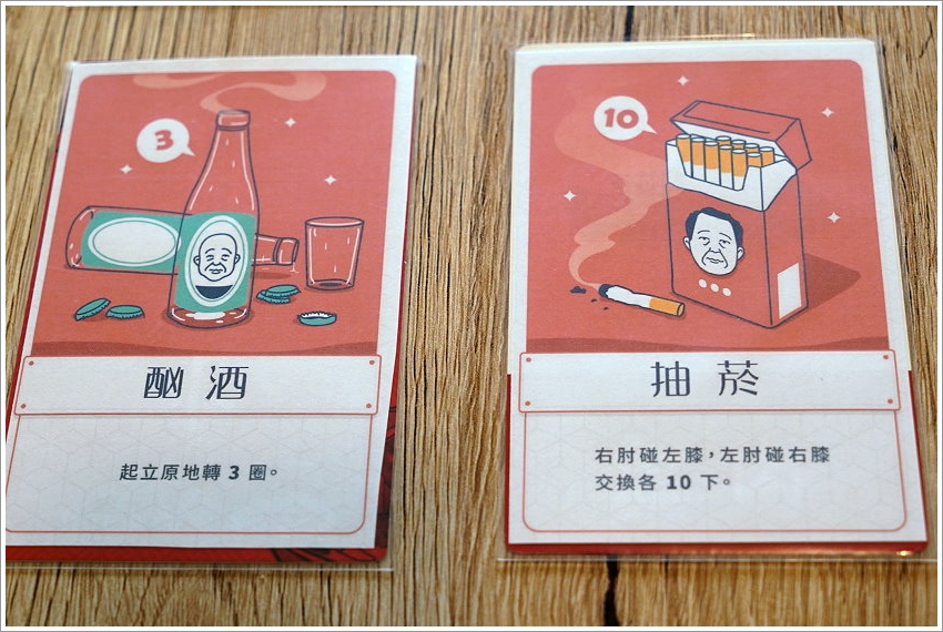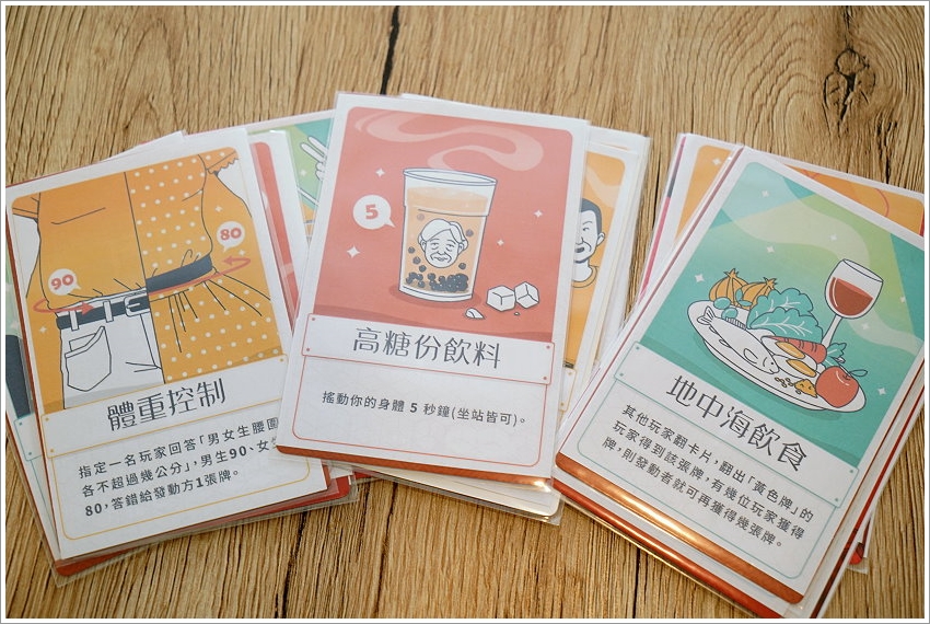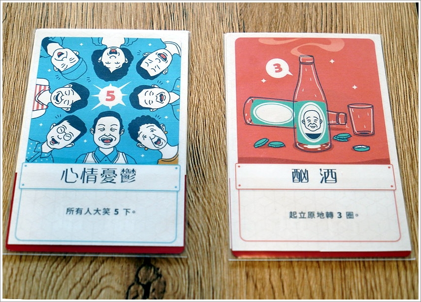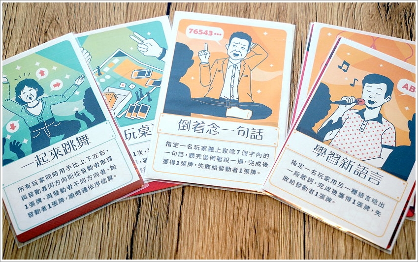 ▼接著就要準備來玩遊戲啦!裡頭一共有四種不同顏色的卡牌,上頭都有指定動作,抽到相同顏色2張卡牌的玩家就可以要求其他玩家來達成指令啦!