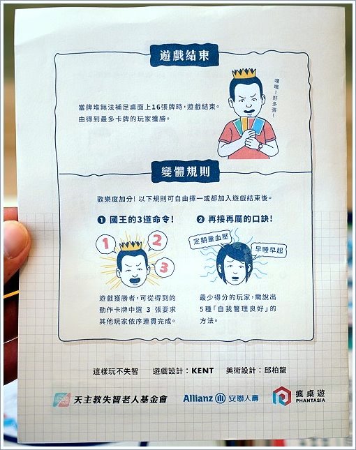 ▼等到桌上的卡牌無法湊滿16張就是遊戲結束的時候啦~這時候拿到最多卡牌的玩家就是獲勝者!最後還可以加碼玩遊戲,像是獲勝者可以從卡牌中挑選三種指令動作要求其他玩家達成,最少得分的玩家也要說出五種自我管理良好的方式即可過關!