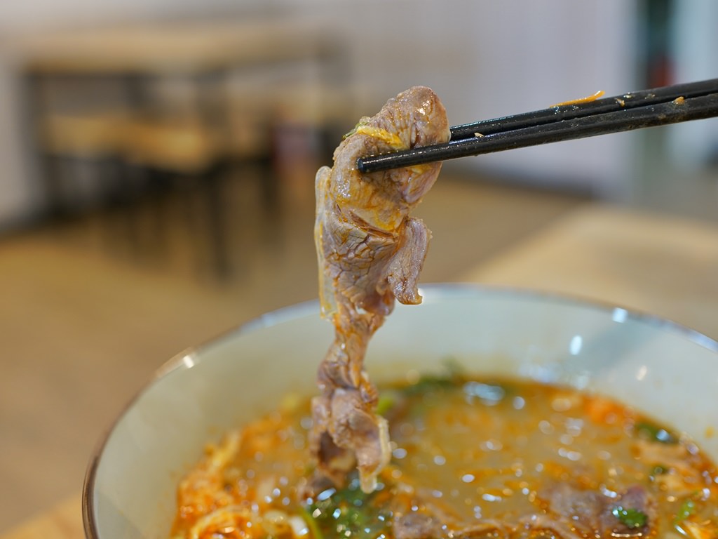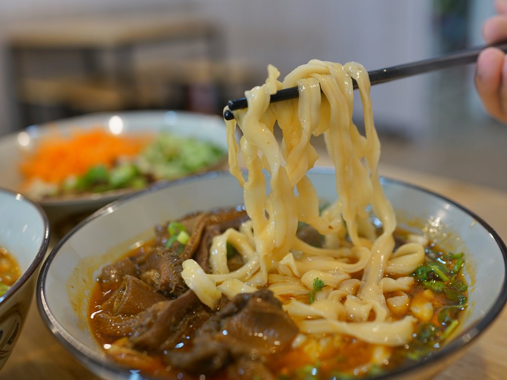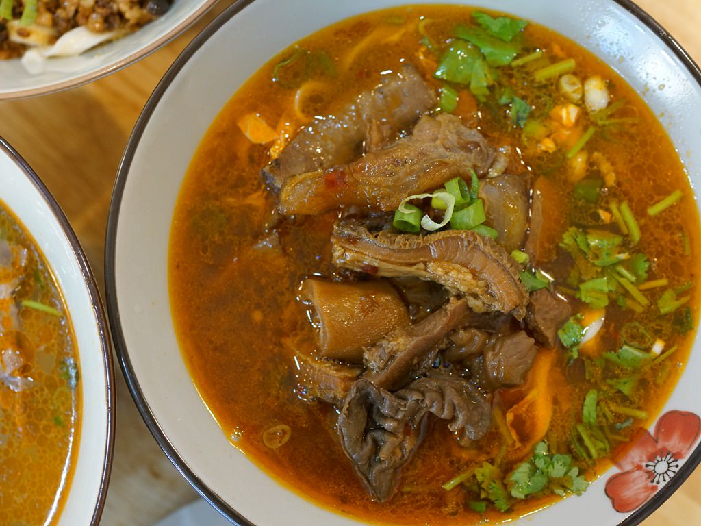 湯頭的部分跟淮南牛肉湯截然不同,這個喝起來又麻又辣,推薦給愛吃辣的朋友~牛雜的份量很多,每一個都很入味,牛肚與牛筋都軟Q好咬,麵條選用手工麵,吃起來Q彈有嚼勁!