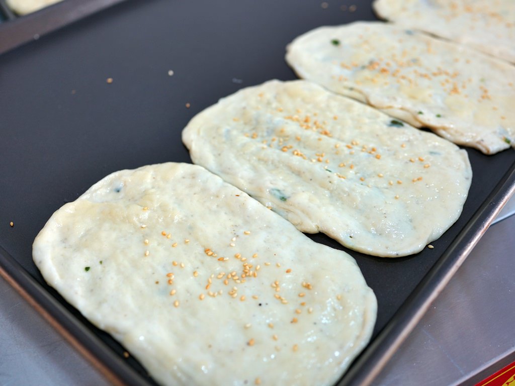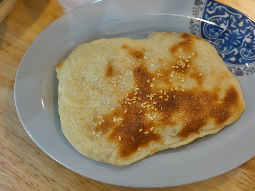 店家手工現桿現烤,我覺得口感比較像窯烤麵包,反而不像台灣燒餅,單吃沒甚麼味道,就是淡淡的白芝麻香,不過沾牛肉湯汁一起吃非常不錯唷,闆娘說沾辣醬也可以~