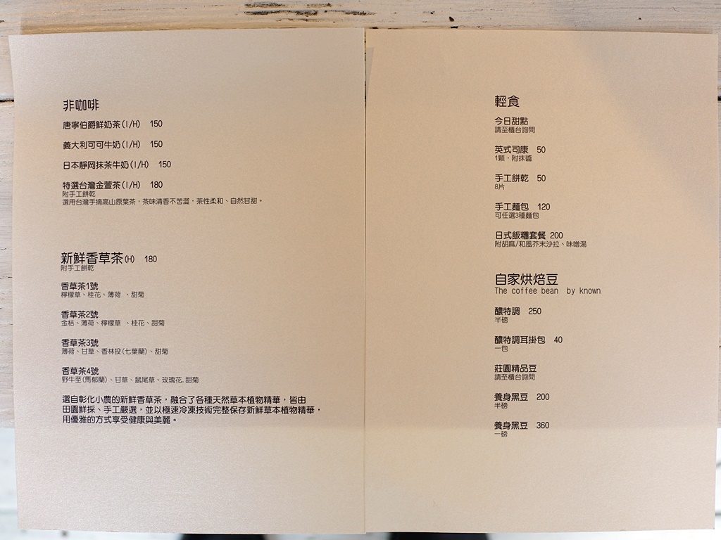 有咖啡類、非咖啡類、新鮮香草茶等飲品,餐點部分則以輕食為主,價位中上。