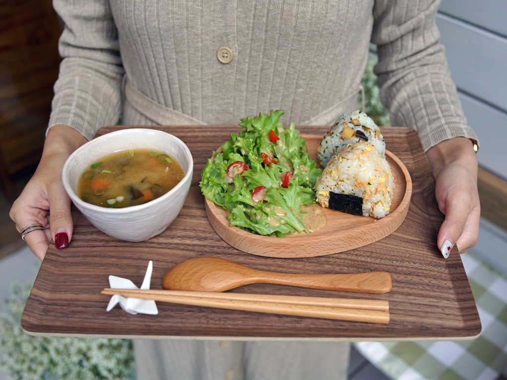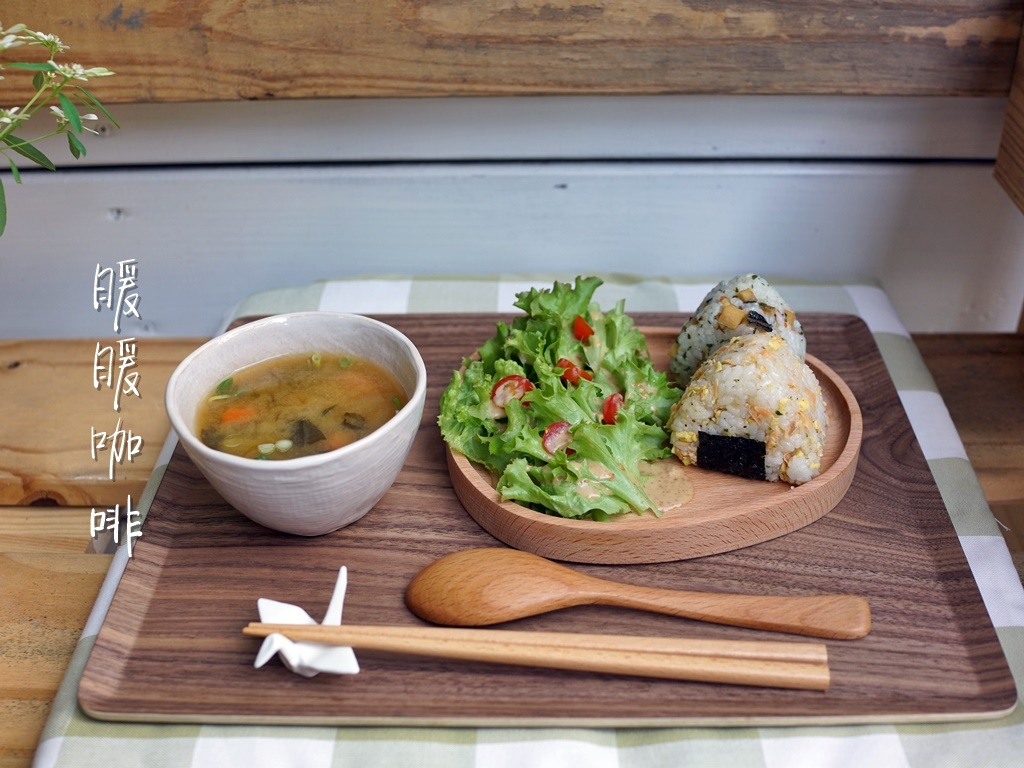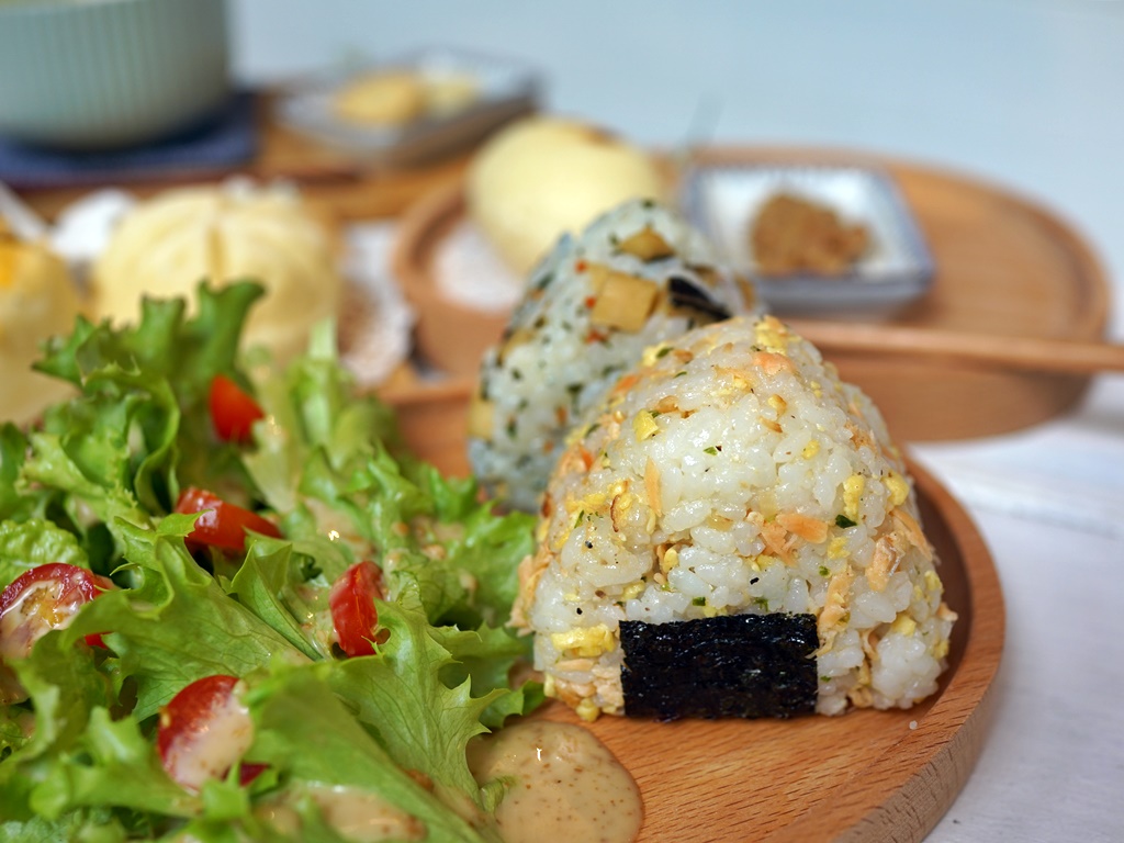 套餐內容有兩顆飯糰、沙拉(可選胡麻醬或和風芥末醬)、味噌湯。