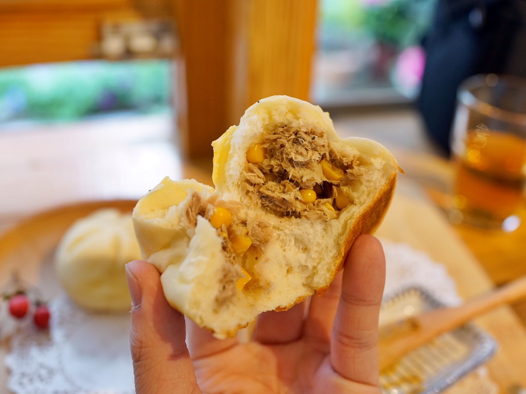 手工麵包吃起來Q彈有咬勁,鮪魚玉米起司的餡料飽滿,整體味道相當不錯。