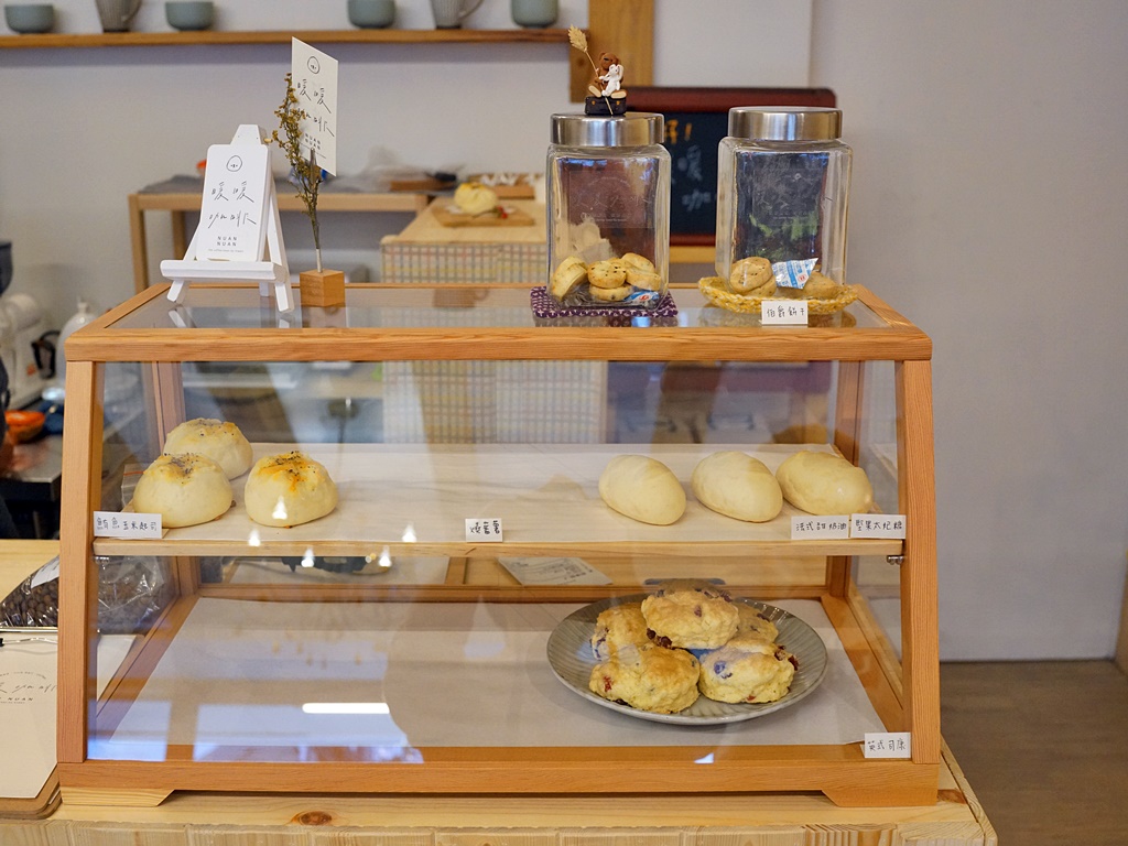 暖暖咖啡主要販售咖啡和手工麵包等輕食,阿華田說他們的咖啡豆是與苗栗頭份知名的醲咖啡合作,也可以說是醲咖啡的分店,每天手工現做的麵包會放在櫃台旁,以現場供應的口味為主,當然越早來選擇越多,我們下午來已經剩沒幾樣了,下次可以早上來看看!