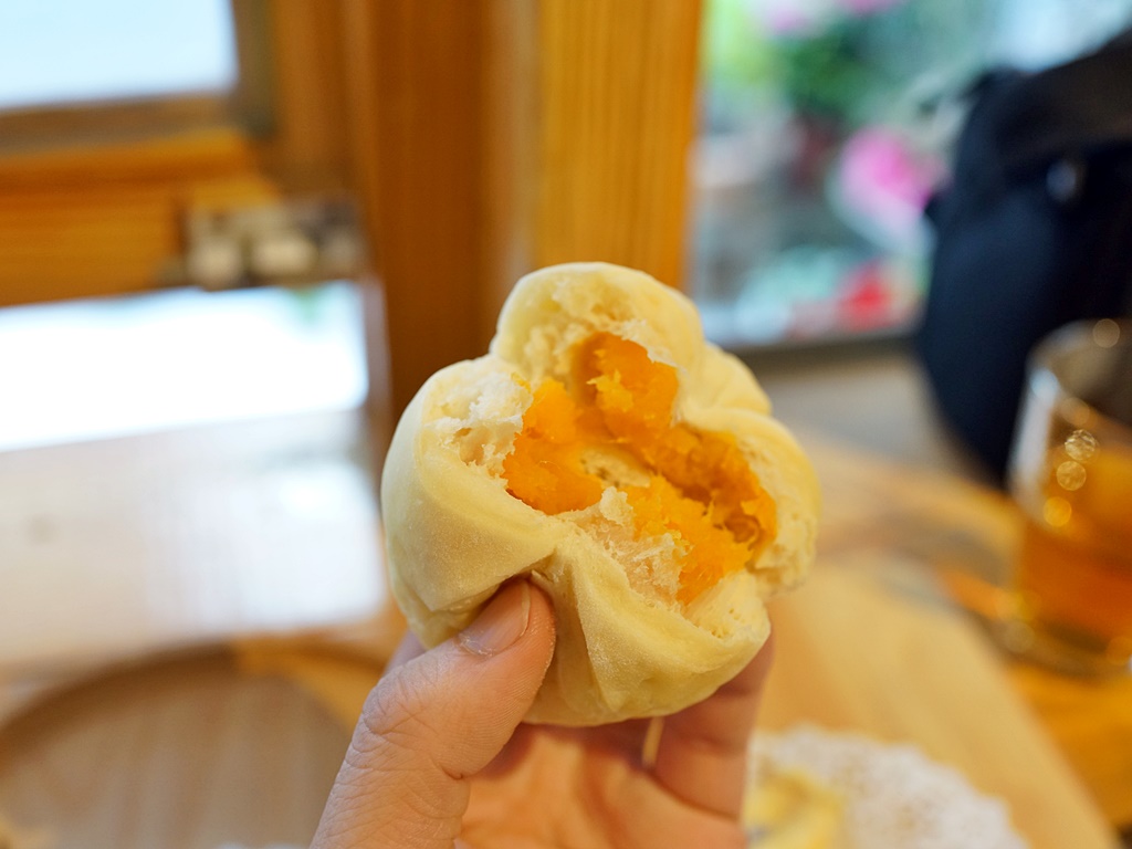 麵包單點一個45元,點組合比較划算,以現場供應的口味為主,當然越早選擇越多,我們下午到的時候已經沒什麼選項了,點了其中三款,分別是鮪魚玉米起司、燒蕃薯和堅果太妃糖。