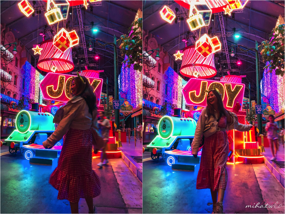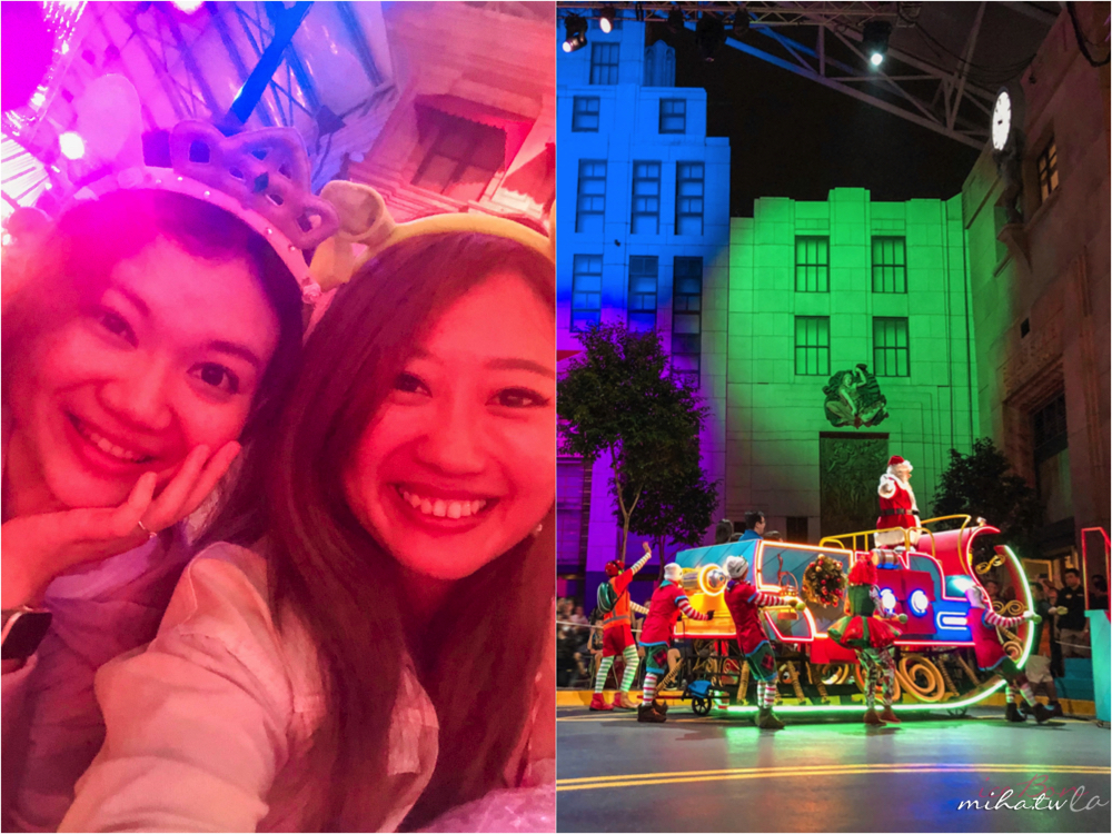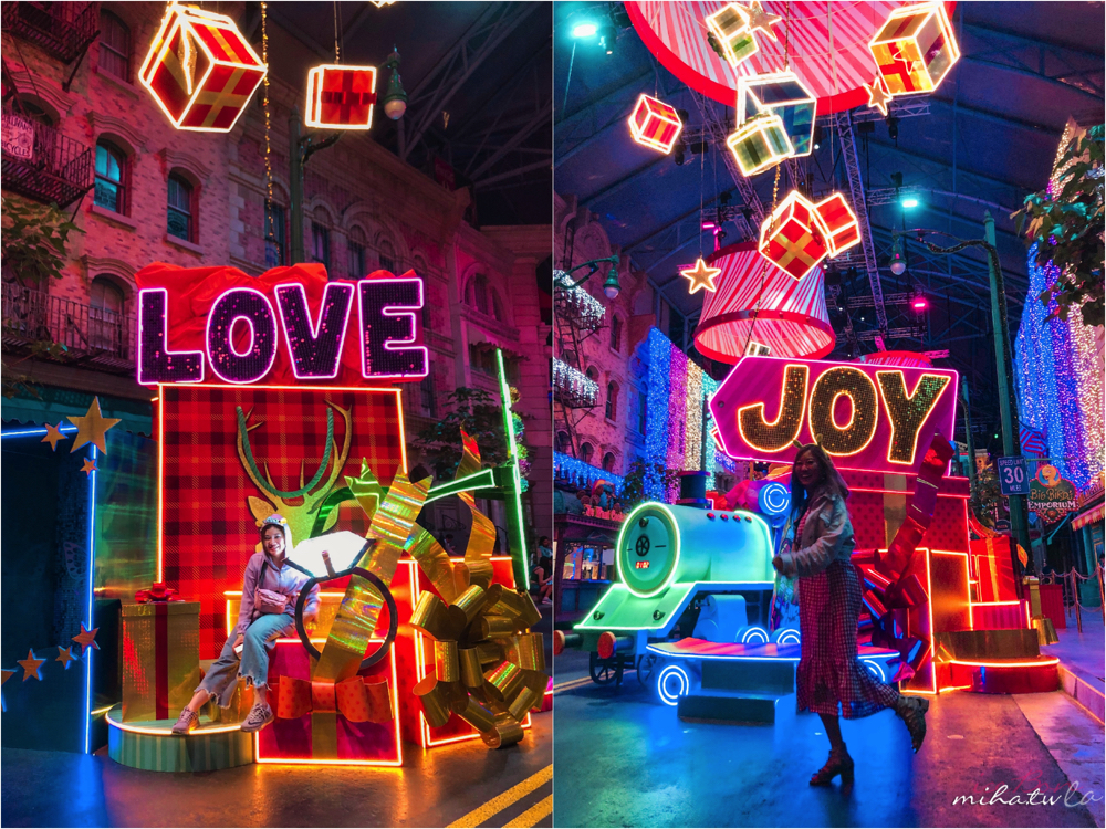 這次的環球聖誕樂還有好多大的裝置藝術,白天看沒有特別感覺,一到晚上開了霓虹燈變超漂亮,完全想像不到他夜晚看起來是這麼美!加上我們那天去下大雨,底上濕濕的拍起來有點反光好像更有feel,怎麼拍都好看!