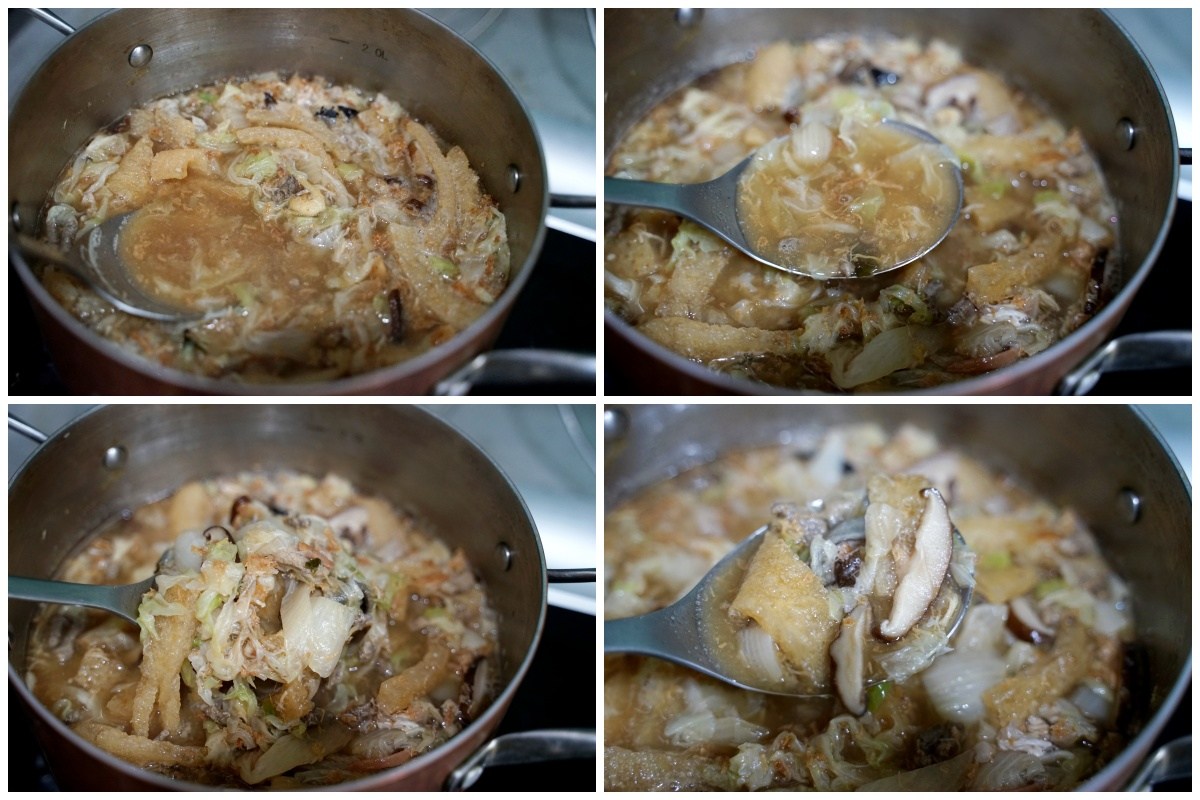 六福美饌把滷白菜必備的配料都準備好,白菜切絲、湯底、香菇、魚皮、炸豬皮、香菇、蛋酥、干貝絲,我們只需要解凍退冰,倒入鍋子裡面加熱就好了!真的超方便拉~