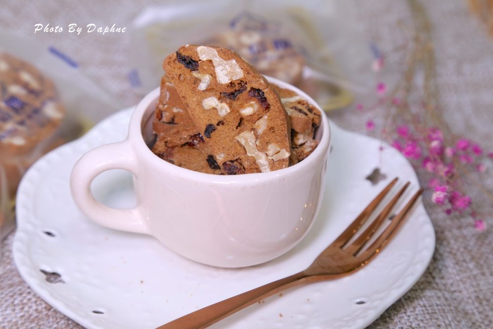 義式脆餅(Biscotti)是用義大利傳統點心改良,特色是麵團不加奶油製作,但不減香濃。經過兩次烘烤,從定型到切片,整體呈現乾燥、鬆脆。但是加入帶點潤度的蔓越莓,讓不愛太乾餅乾的人都能接受,蔓越莓被萊姆酒浸泡,芳氣襲人,與品質控管嚴格的加州核桃配黑咖啡或搭配茶品一起吃有著成熟的大人味。