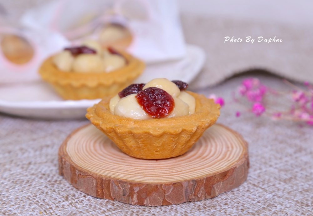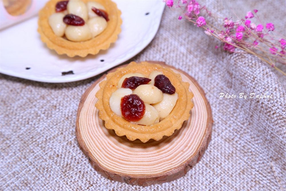 堆疊在塔內的夏威夷豆每顆都飽滿得很一致,緊密的湊合,每顆夏威夷豆都受到溫度與時間精準掌控,烘焙出果仁香氣,夏威夷豆有很絕妙的獨特清香奶油味,調味成鹹的甜的都適合,用蔓越梅果乾搭襯,美化外觀,也加乘口感與風味。塔皮使用部分,同樣添加上面有提到的法國依思尼奶油,讓塔皮鬆香之外,也因為添加依思尼奶油,塔皮給人的奶香是無壓的輕盈感,非濃又嗆的加工物味。