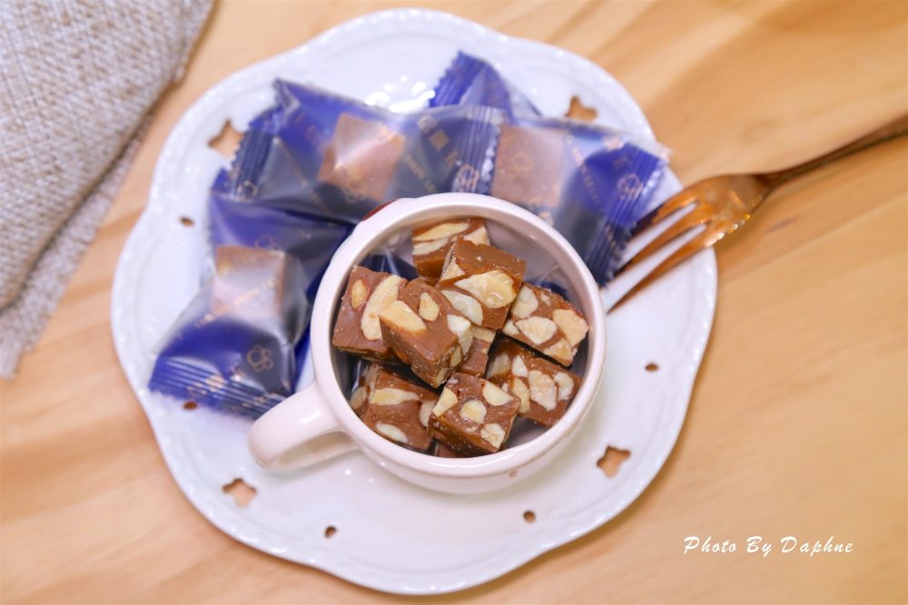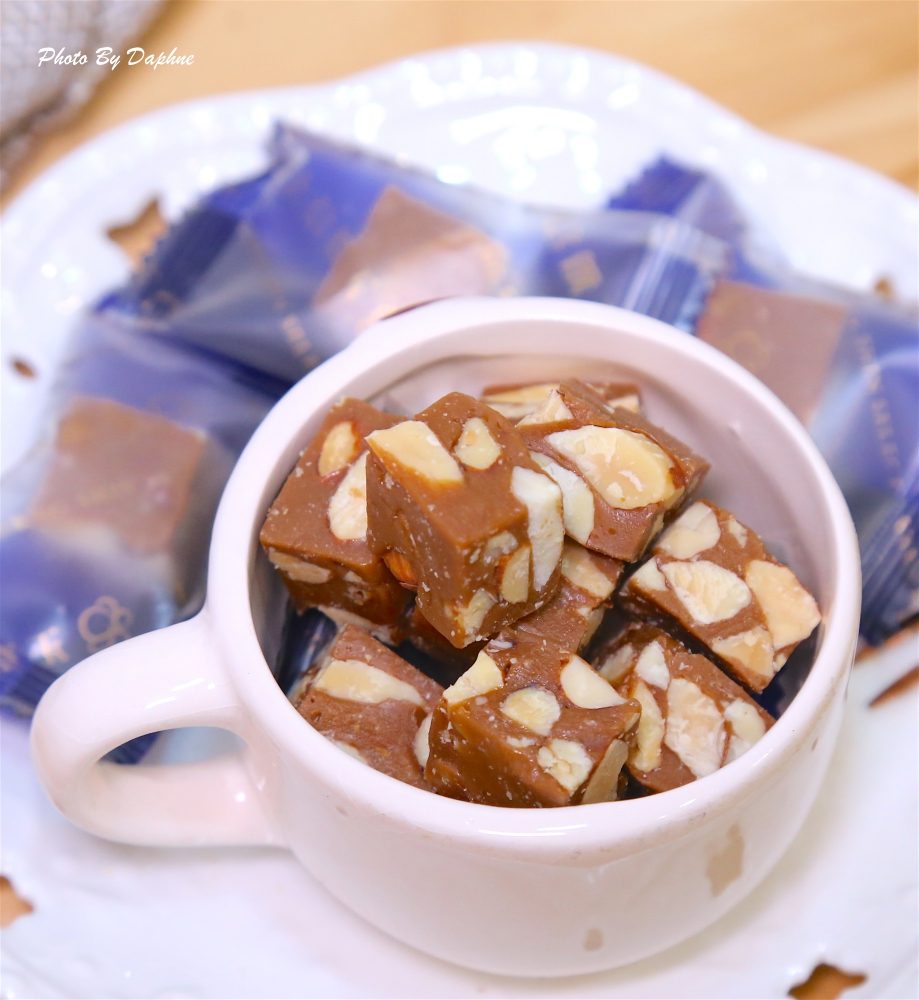 太妃糖可做成硬糖或是軟糖,這裡是做成硬糖。加熱熬煮焦糖的過程在人工進行之下,需要不斷地攪拌、觀察顏色變化,避免苦味過重甚至過焦,讓奶油與焦糖相融在最恰當,不焦苦,不甜膩又帶有奶香的最好狀態。太妃糖與杏仁緊密契合,咬起來甘脆但不過硬,杏仁看起來是整堆整顆倒進焦糖糖漿後再成形切塊的,用料豐富實在,吃得到很多杏仁顆粒,而不是杏仁脆片。有淡淡木質香氣,對愛吃或不愛吃甜的人都有吸引力。