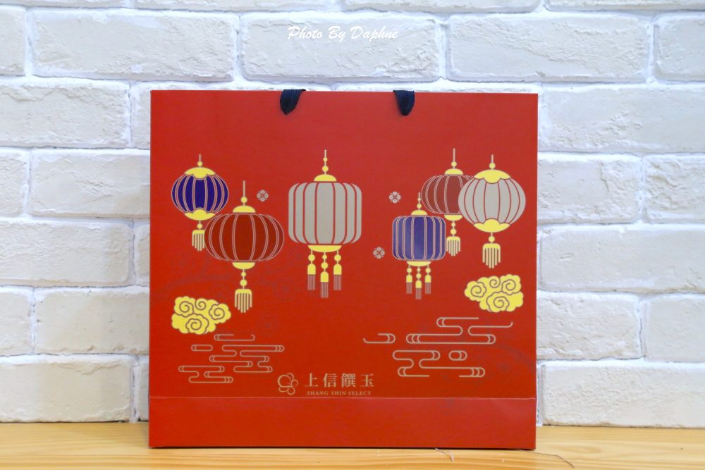 晶燦禮盒提袋圖案則是印製燈籠圖案,有濃濃的文化與年節氣氛,紅燈籠象徵團圓,是喜氣的象徵。提袋材質都有厚度不易破,產品吃光了還繼續留下來使用。