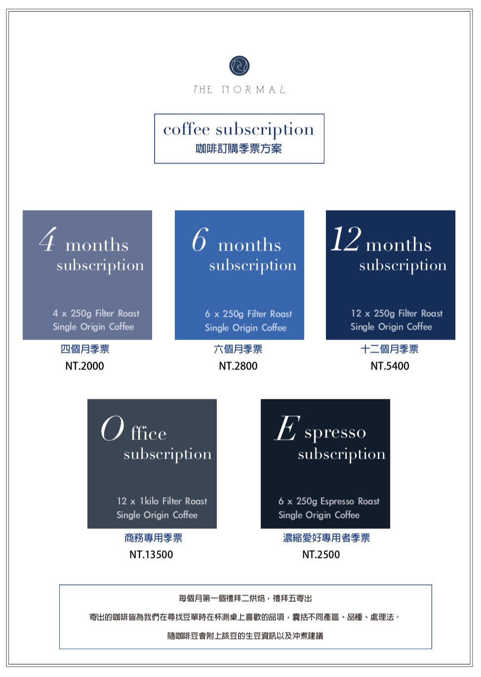 秉持精品咖啡應該更深入尋常百姓家的理念,THE NORMAL也有販售成包的精品咖啡豆,自己在家(或在公司),也可以享受精品級的咖啡囉!比較特別的是,除了到店購買,還提供了「咖啡豆訂閱」的服務,每個月會自動把咖啡豆寄到你家,超適合懶得頻頻出門、又很在意豆子新鮮度的人。
