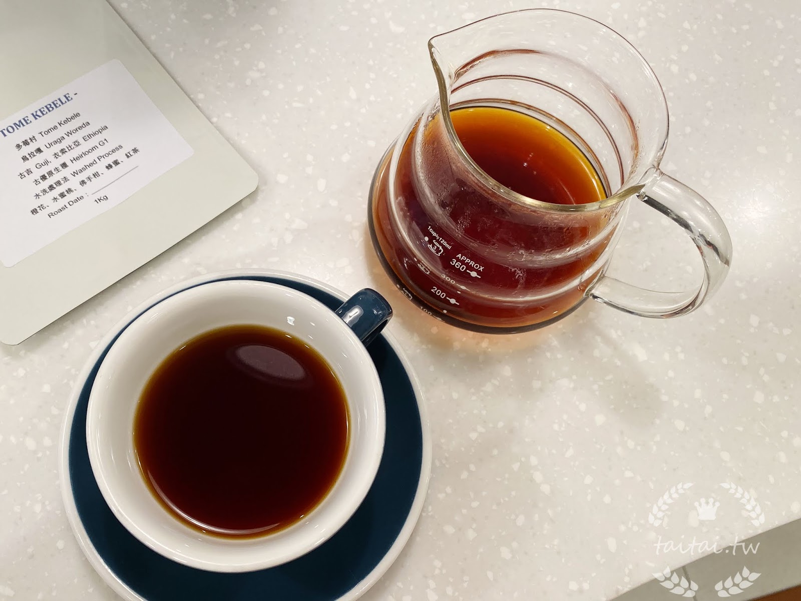 第一杯單品黑咖啡來自衣索比亞古吉產區的咖啡豆,整體口感是乾淨而明亮的,建議喝單品咖啡時,先聞聞香氣、不要馬上入口,因為溫度高的時候會讓口感有所偏差。可以在不同溫度來品嚐同一杯咖啡,溫度越涼味覺也會更被凸顯。在咖啡端到顧客面前之前,咖啡師會先取出一小杯試喝確認風味,也會使用測試儀來測試咖啡的濃度。不過,並不是愈濃愈好喝,咖啡的濃度只與味覺上的厚實度有關聯。
