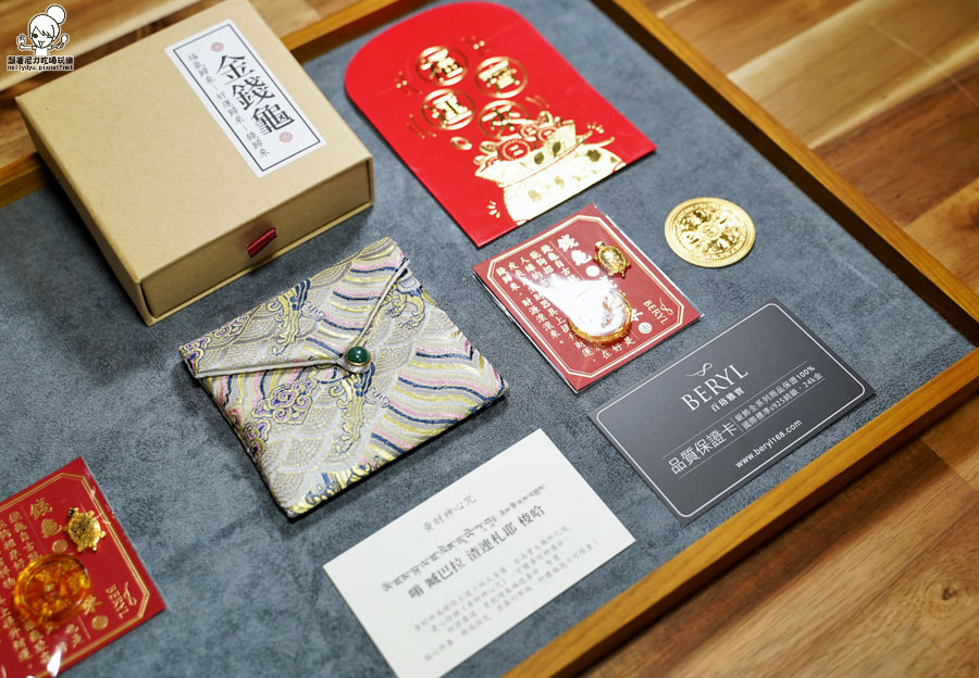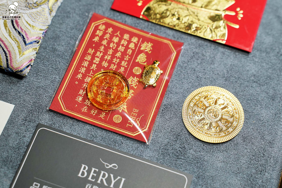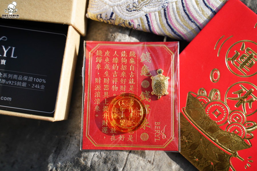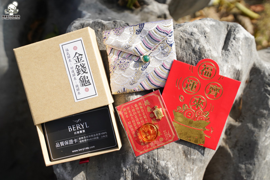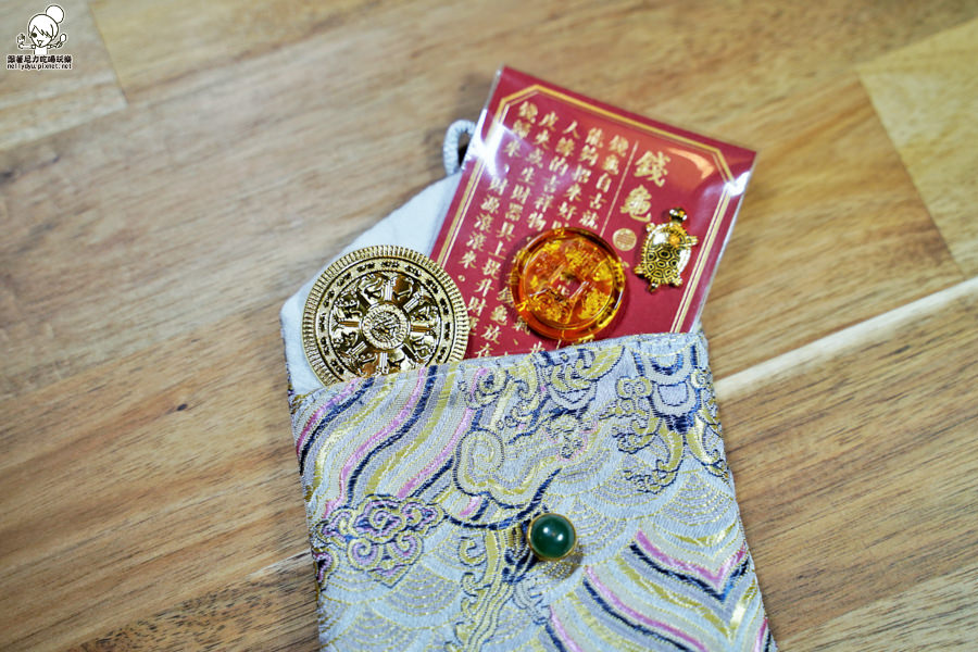招財金錢龜御守禮盒內金錢龜、琉璃發財金錢母、五行刺繡錦囊袋,一整個是好彩頭的開始