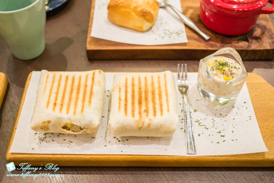 這道BBQ照燒磚餅是用餐當天我最喜歡的餐點,我覺得他算是熱壓吐司升級版~看起來很像墨西哥捲的餅皮+帕里尼的內餡,旁邊還有附一小杯的鮪魚玉米沙拉。老闆娘說原本的BBQ照燒磚餅裡面是有”香菜”的,貼心的老闆娘有先詢問我吃不吃香菜,知道我不吃後就把香菜拿掉了,超感動!!