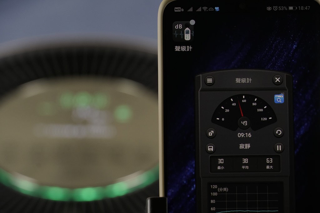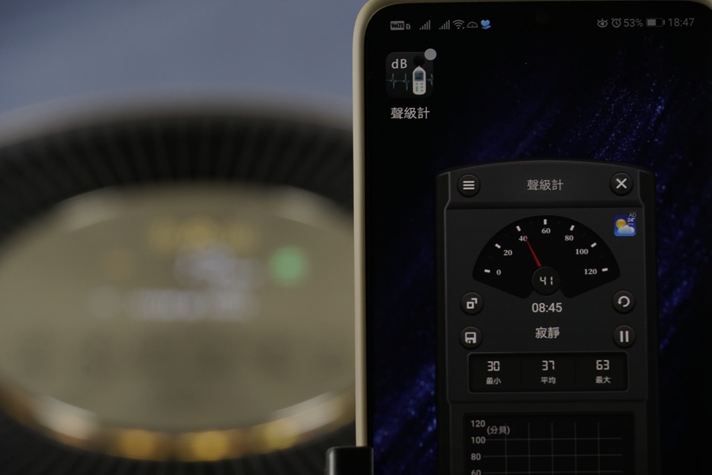風量等級龍捲風,雖然可以聽到聲音,但依然很安靜,音量測得 47 分貝。