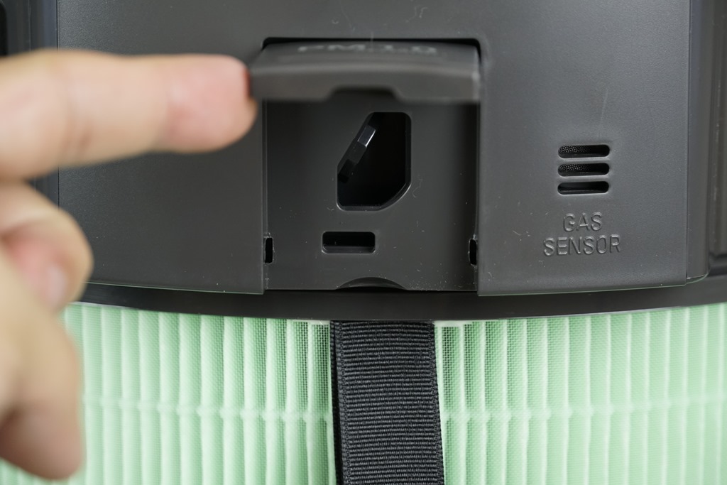 上方的智慧顯示面板可顯示 PM10、PM2.5、PM1.0 的數值,若偵測到異味也會在面板上提醒。除此之外,也會同時以燈號的顏色來讓使用者快速知道目前的空氣品質。