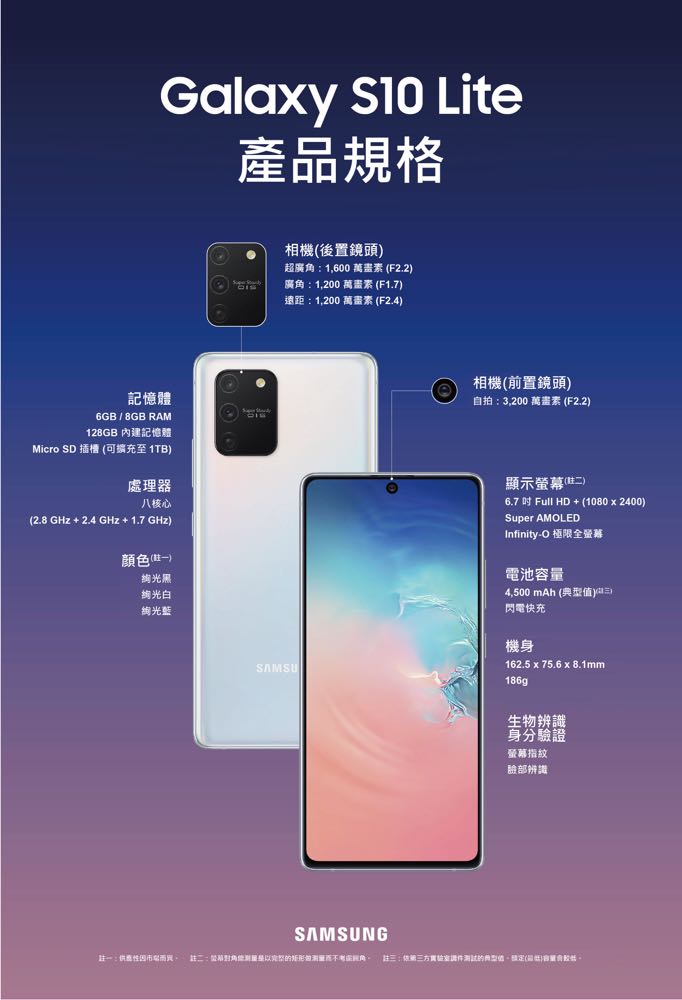 Galaxy S10 Lite 的規格方面採用 6.7 吋 Full HD+ (1080 x 2400) Super AMOLED Infinity-O 極限全螢幕、八核心處理器、6GB / 8GB RAM、128GB ROM、16MP 超廣角 + 12MP 廣角 + 12MP 遠距三顆鏡頭組合、32MP 前置鏡頭與 4500mAh 電池容量。