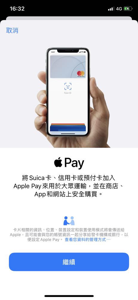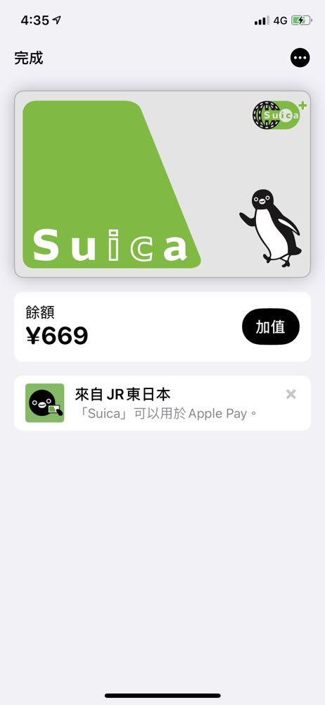 步驟 2. 回到「錢包」app,點選右上方的「+」,直接選下方的「繼續」,就會發現 Suica 那熟悉的企鵝、綠綠卡片畫面出現了!