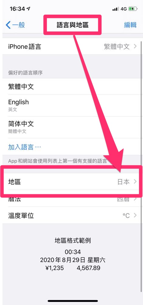 步驟 1. 進入 「設定」>>>「一般」>>>「語言與地區」,下方有個「地區」,進去將它從「台灣」改成「日本」。