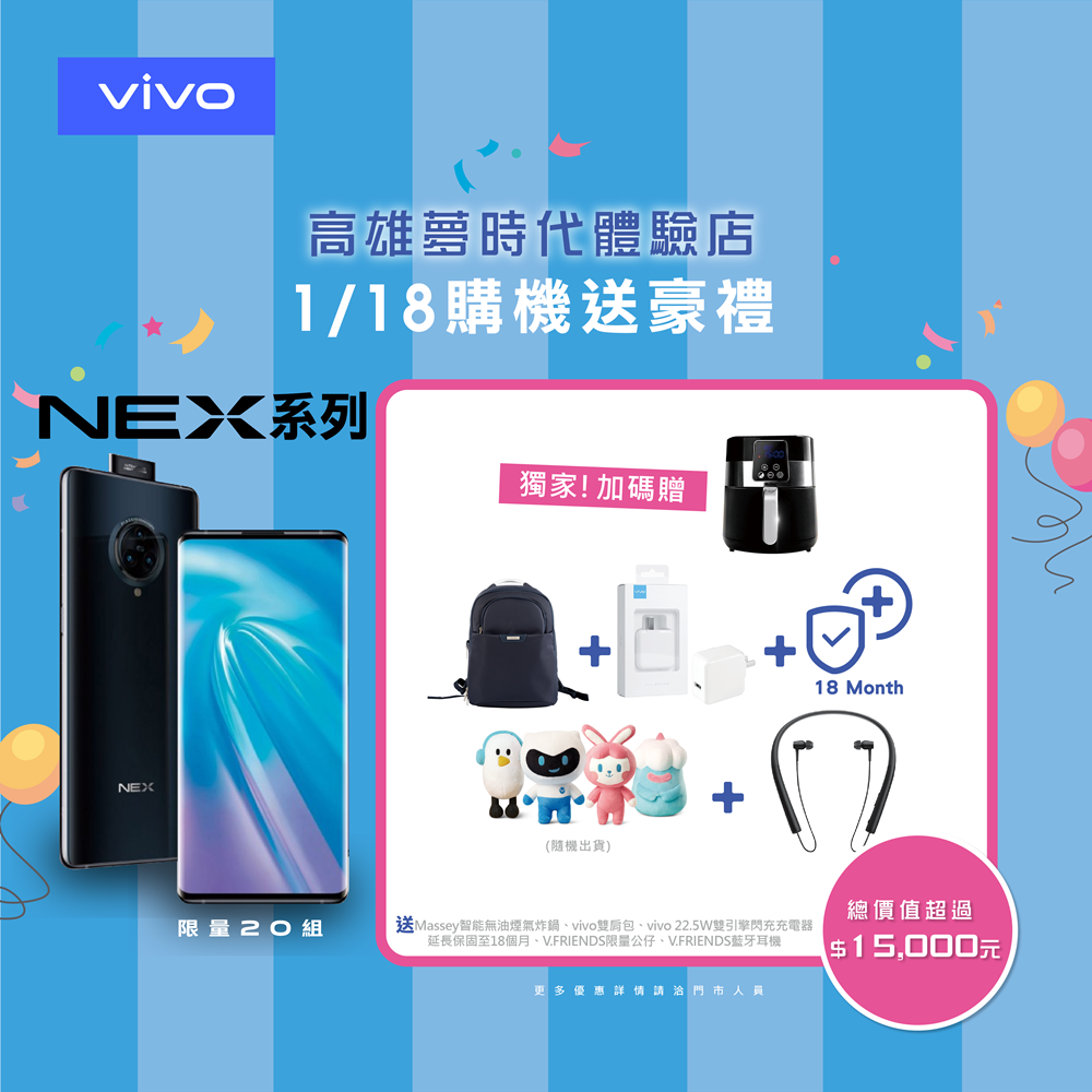 為了歡慶vivo夢時代體驗店盛大登場,vivo即日起至1/14募集百名金牌頭號粉絲,報名獲選將於現場頒發頭號粉絲獎狀與全球獨家vivo club T恤等粉絲專屬禮,並於1/18-1/23首六日推出歷來最殺購機限定優惠,vivo NEX系列加碼送超夯氣炸鍋、V系列加碼送果汁機,Y系列手機最低不到8千元、卻可帶走近9千元贈品,全系列機種最高可享超過15,000元超值好禮。