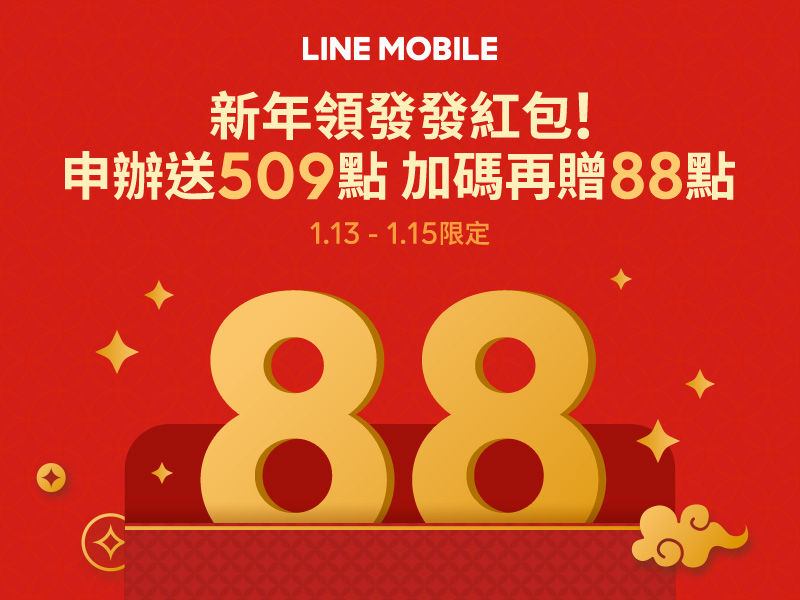 2020 新年加碼再加碼,1/13 至 1/15 LINE MOBILE 再祭出紅包快閃活動,申辦 LINE MOBILE 299/399/499 任一方案,新年發發紅包直接發,除每月2% LINE POINTS 及各方案贈 109/209/509 點外,可再享 88 點 LINE POINTS 新年紅包,每月回饋最高 12%,2020 年初直接辦直接省,LINE MOBILE 要陪大家一起拿紅包過好年。