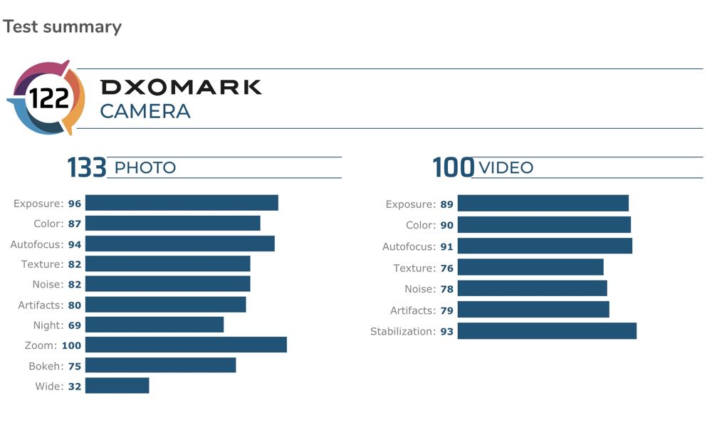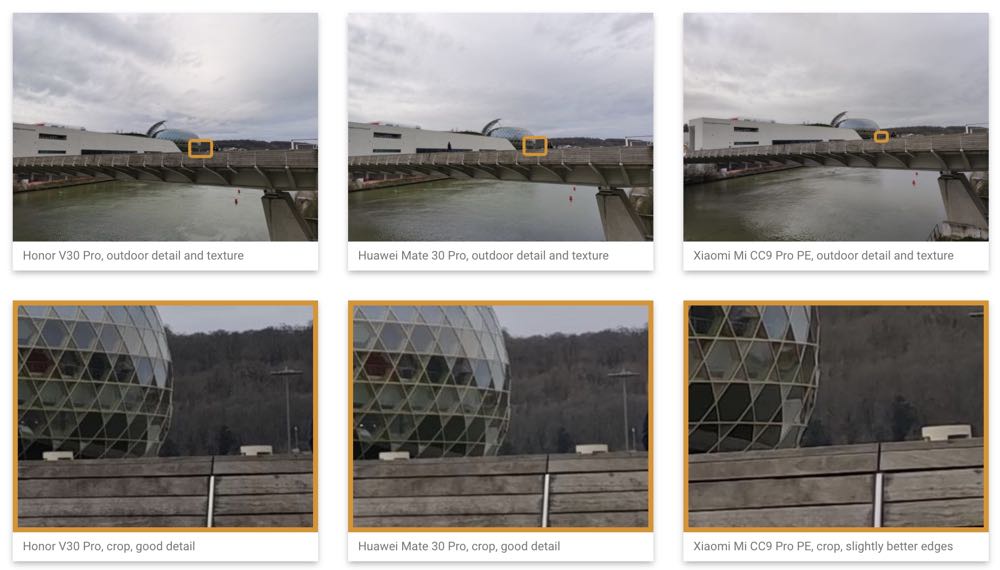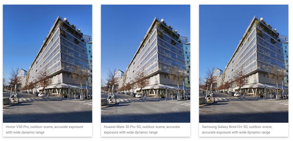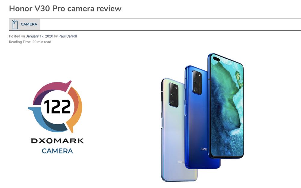 榮耀 V30 Pro 在鏡頭方面擁有 4000 萬主鏡頭 + 1200 萬超廣角鏡頭 + 800萬長焦鏡頭三組合,主鏡頭和長焦鏡頭兩顆都支持著光學防抖,1200 萬超廣角鏡頭支援 AI HDR+ 和 5 軸錄影智慧防手震。此次榮耀 V30 Pro 在 DXOMARK 的相機測試中拿下了第二名,介於華為 Mate 30 Pro 5G (123 分) 與小米 CC9 Pro 尊享版 (121 分) 。根據 DXOMARK 表示,這三款的拍照特色小細節都非常地相似,而榮耀 V30 Pro 在夜景拍攝、散景模式、細節、曝光等靜態照片的表現部分表現都相當的優異,尤其是在夜間模式中更是能夠保留著主體的細節。