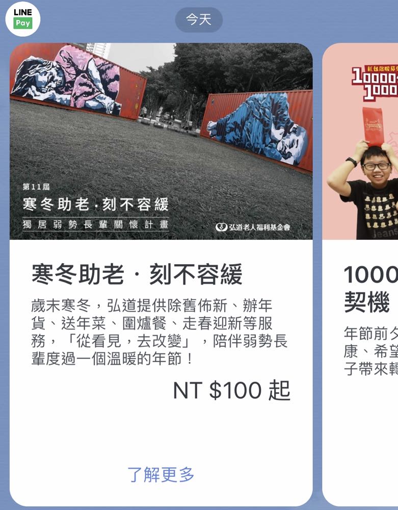 3) 選好後,便能透過 LINE Pay 提供的各種方式來進行捐款,讓自己的善意迅速又輕鬆的傳送出去。