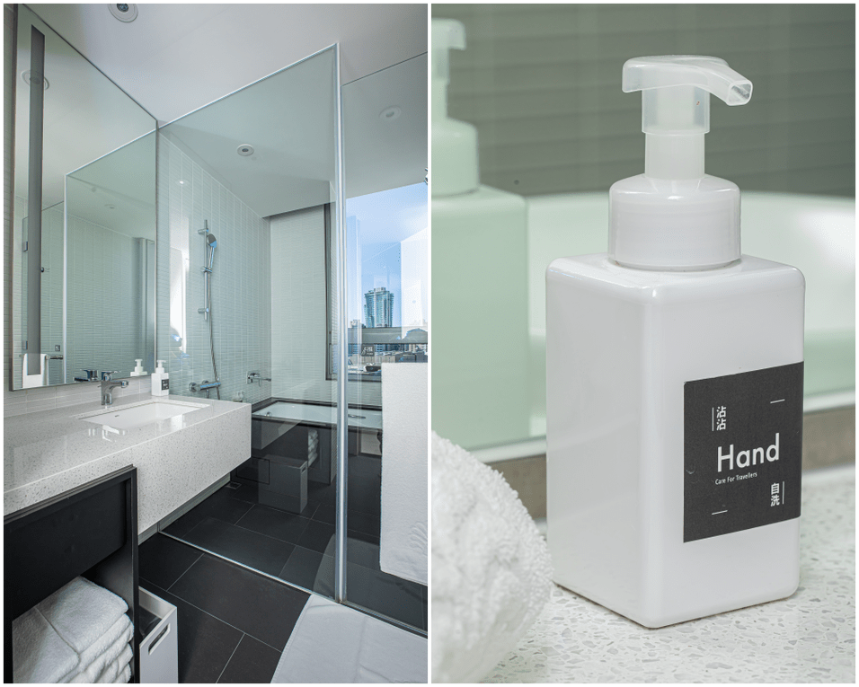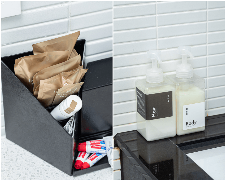 再來浴室部分也是大毅老爺行旅的特色之一,裡面一樣是黑白搭配,但所有的自家備品都有著非常貼切的簡單字句,反倒給人一種活潑感