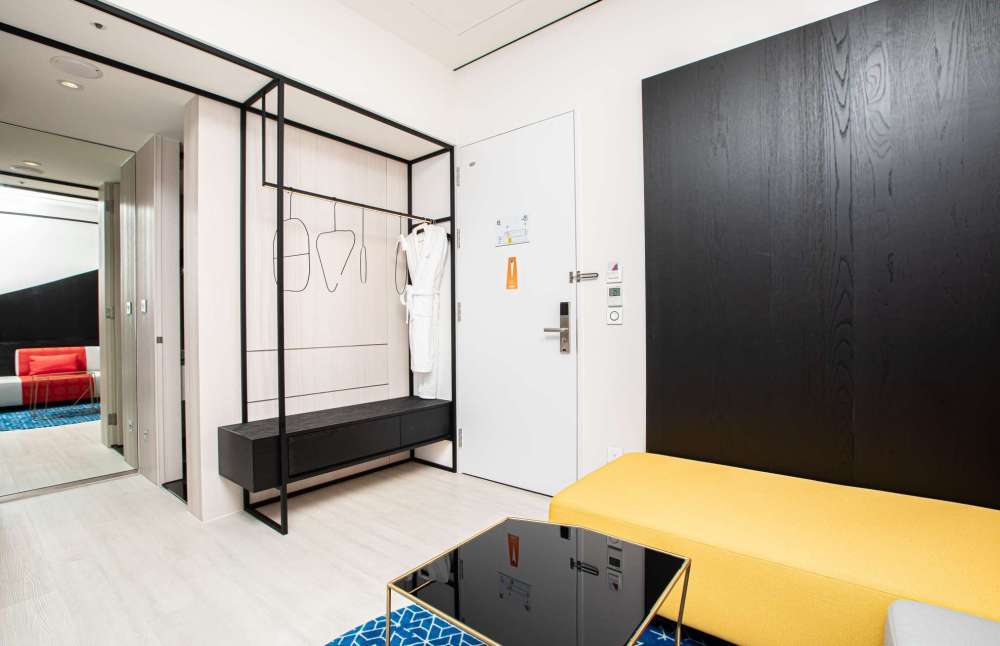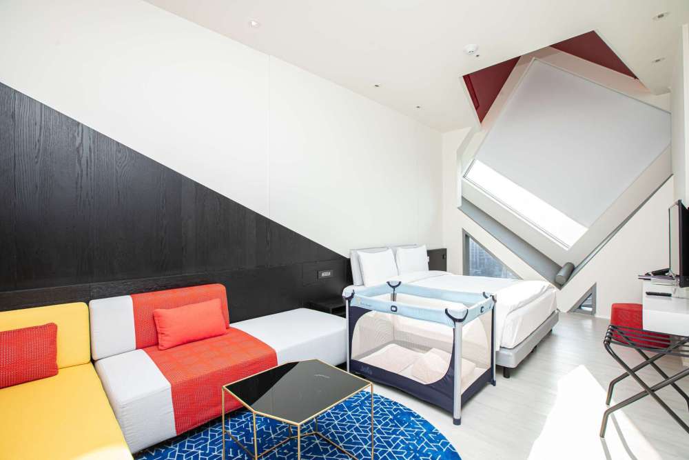 進到房間裡面,就是大型的多色塊沙發跟行李放置及衣物空間