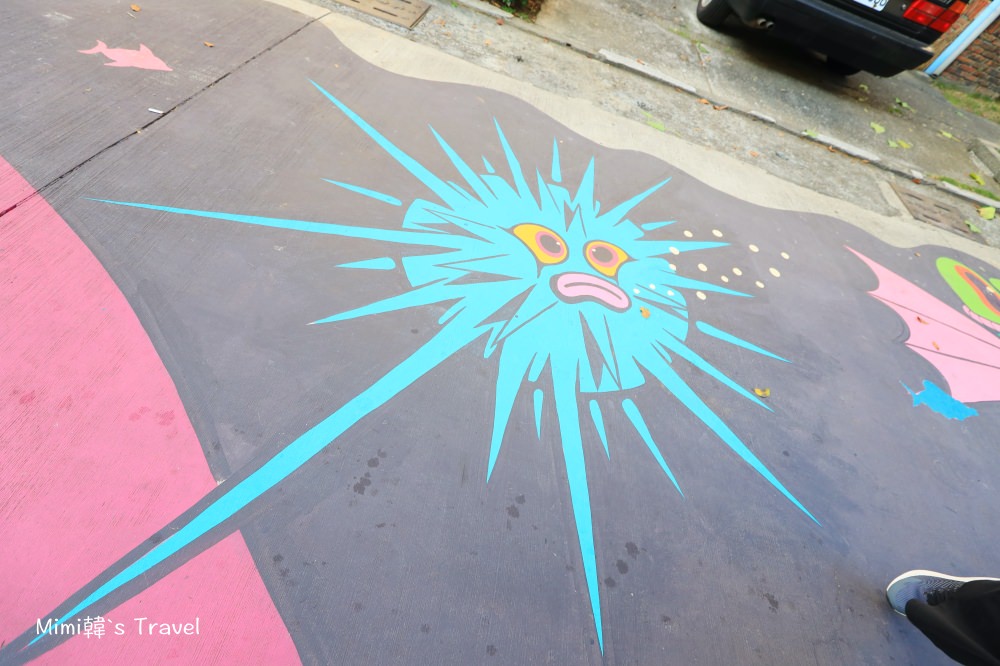 連地上都很有戲,海底世界延伸在整條小巷車道中,連一旁廢棄的車輛也被當成作品的一部分。