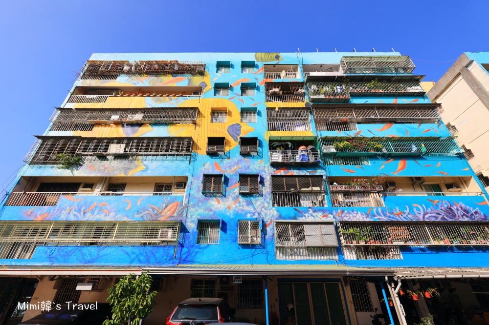 慢慢逛到衛武迷迷村裡的尚勇街,這裏以城市水族館為主題,作品都是直接呈現在樓房正面,許多生動的魚兒悠游其中,整片望去超壯觀的!應該沒看過這麼大的水族館吧