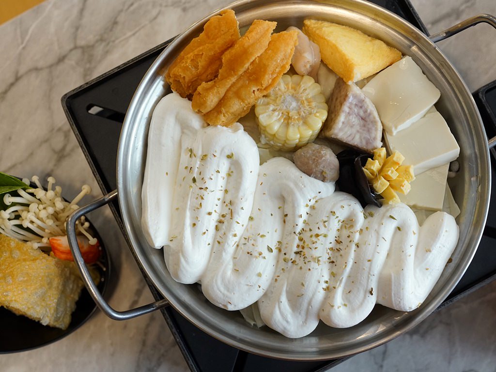 奶蓋鍋是店家的招牌,沒想到奶蓋可以跟火鍋結合,好有創意唷!一般小火鍋店常見的口味就是起司牛奶之類的,第一次看到濃稠的奶蓋鋪在火鍋上,不知道煮起來是什麼滋味呢?火鍋裡面還有非常多配料,像是玉米、芋頭、豆腐、油條、火鍋料等,還有一層高麗菜墊底,也難怪他們附的蔬菜桶那麼小巧啦~