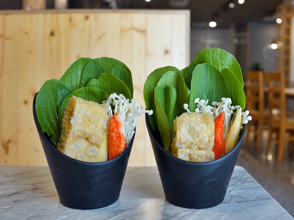 火鍋均附蔬菜桶,裡面有時蔬、金針菇、炸豆皮、玉米筍、蟳味腿,一開始會覺得怎麼菜盤那麼少,那是因為店家將大部分的蔬菜、配料都放到火鍋內了,接著看下去就明白囉!