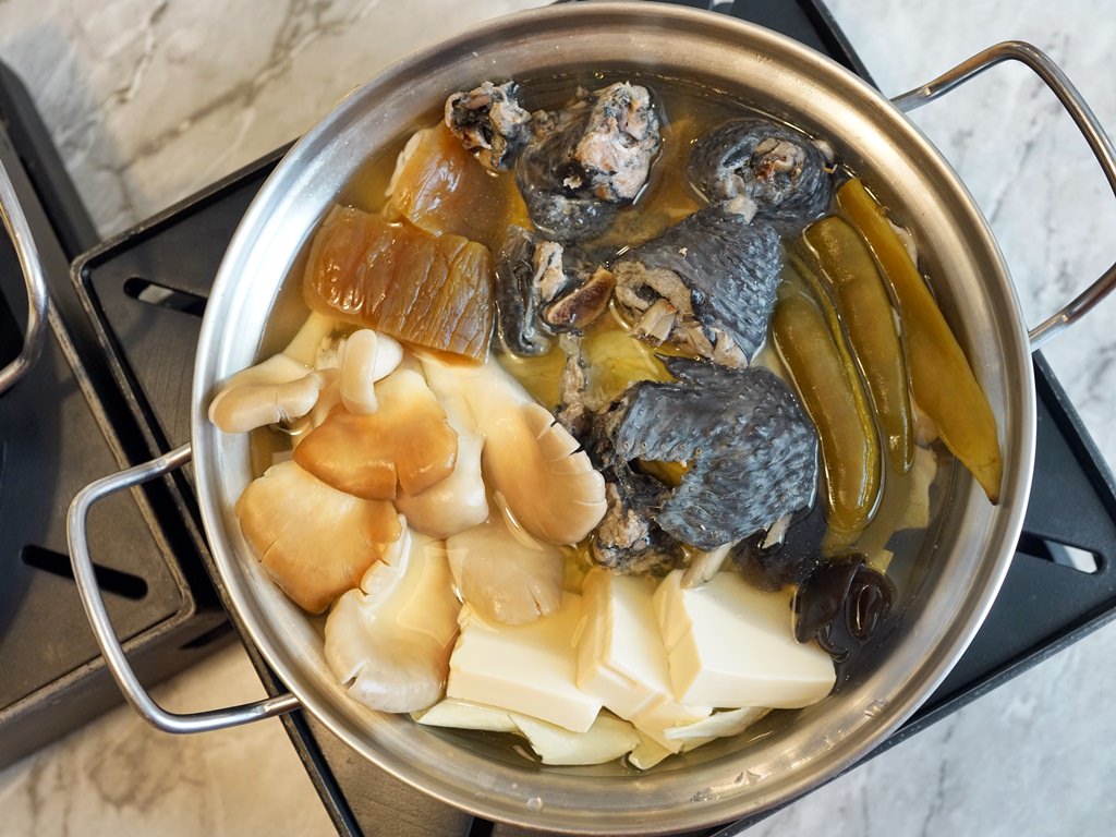 這是屬於好料鍋的選項之一,主食已搭配好,就是烏骨雞本人啦!配料的部分有豆腐、菇類、木耳、高麗菜等,跟剛剛的奶蓋鍋不太一樣,店家會針對湯頭選擇適合的配料,這點我覺得蠻用心的,剝皮辣椒煮湯真的好好喝,喝起來十分清甜爽口,這鍋我真心愛,喝到無法自拔~