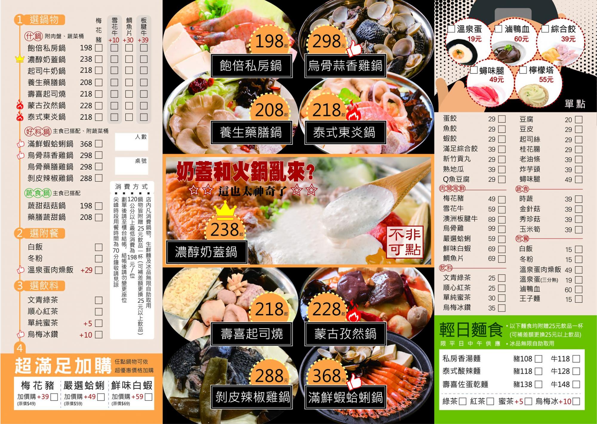 先選鍋物再選附餐跟飲料,每鍋都會附贈25元的飲品一杯,也可補差額更換25元以上飲品,整體價格198~368元,我覺得還算蠻合理的,內用可享用自助吧的生鮮麵、冰淇淋吃到飽!