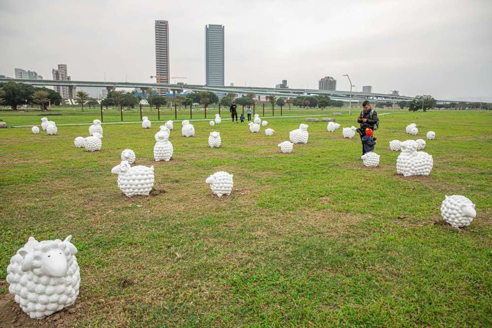 原來詩步領羊這個名字,其實是很有台灣意識的諧音之作,因為台語裡面有一個形容詞叫做斯不令央(心情愉悅之意),而出生於高雄的藝術家蔡坤霖就以這個概念為發想,再加上之前在留學英國時在鄉間見到大批羊群,心情也變得非常療癒,所以才打造出這樣很有童趣的以60隻不同大小綿羊為主體的裝置藝術