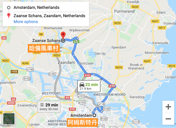 ・搭乘火車:坐火車到「Zaandijk Zaanse Schans」,下車後步行約15分鐘抵達
