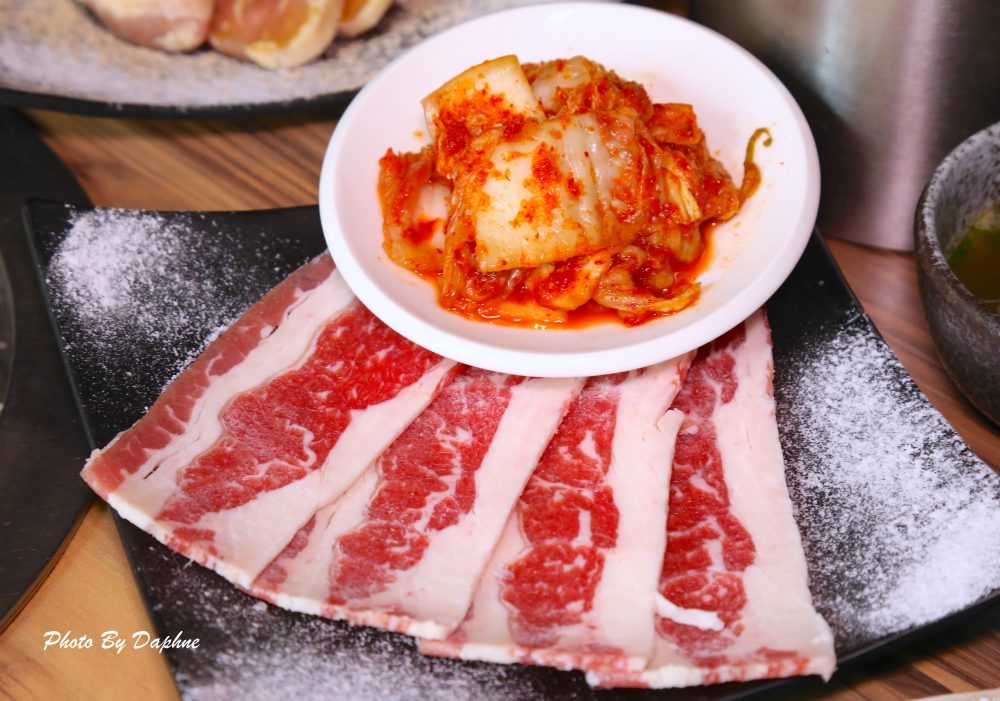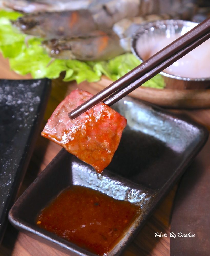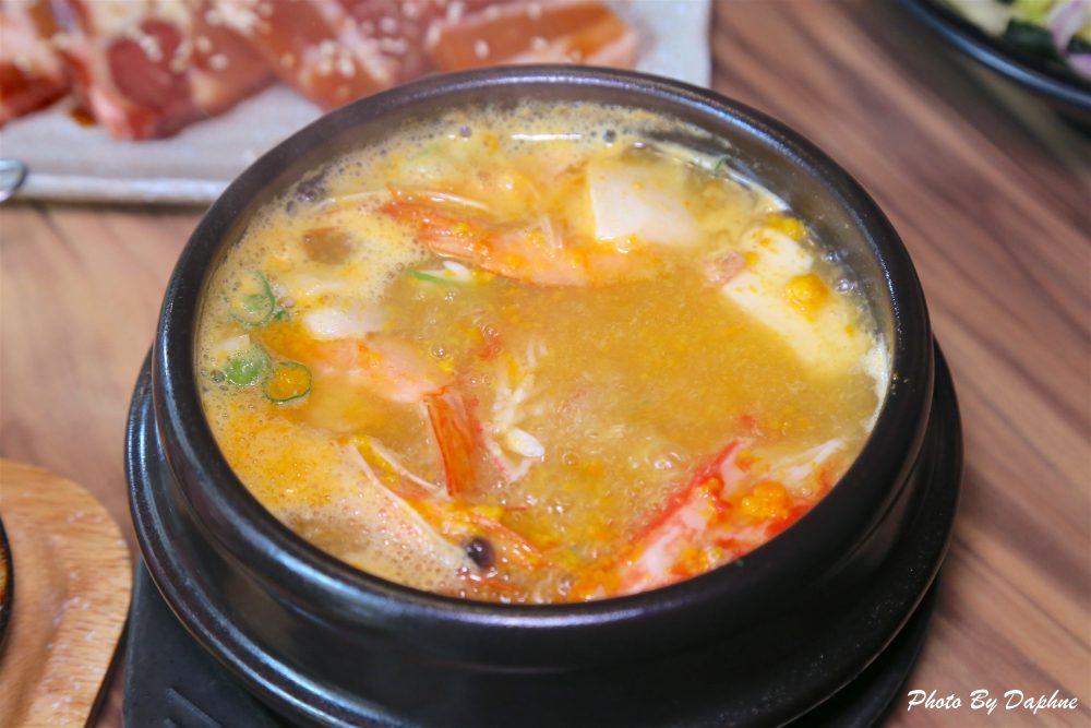 ▼剛開始喝有一點點如同韓國大醬湯般類似的味道,但是不像大醬湯的鹹辣與口味偏重。食材有蟹肉棒、鮮蝦、豆腐、蛤蜊、鯛魚片、杏鮑菇,是海鮮精華融合蟹黃的鮮濃,令人喝到欲罷不能,一滴不剩,不想花時間烤海鮮,點這鍋就對了!