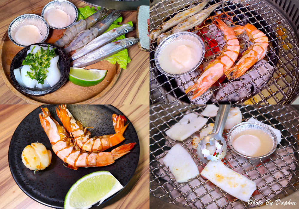 連續吃多種類的肉,用海鮮收尾吧!海鮮有柳葉魚、蝦、玫瑰花枝、生食級干貝。少量多樣,兩個人分食剛剛好,生食級干貝可淋上雞湯烤或是直接火烤,無論原始或是高湯調味都濃郁甘甜,柳葉魚烤過後金黃誘人,蝦子肉質硬實不鬆軟,花枝緊實彈牙,都有不錯的表現。