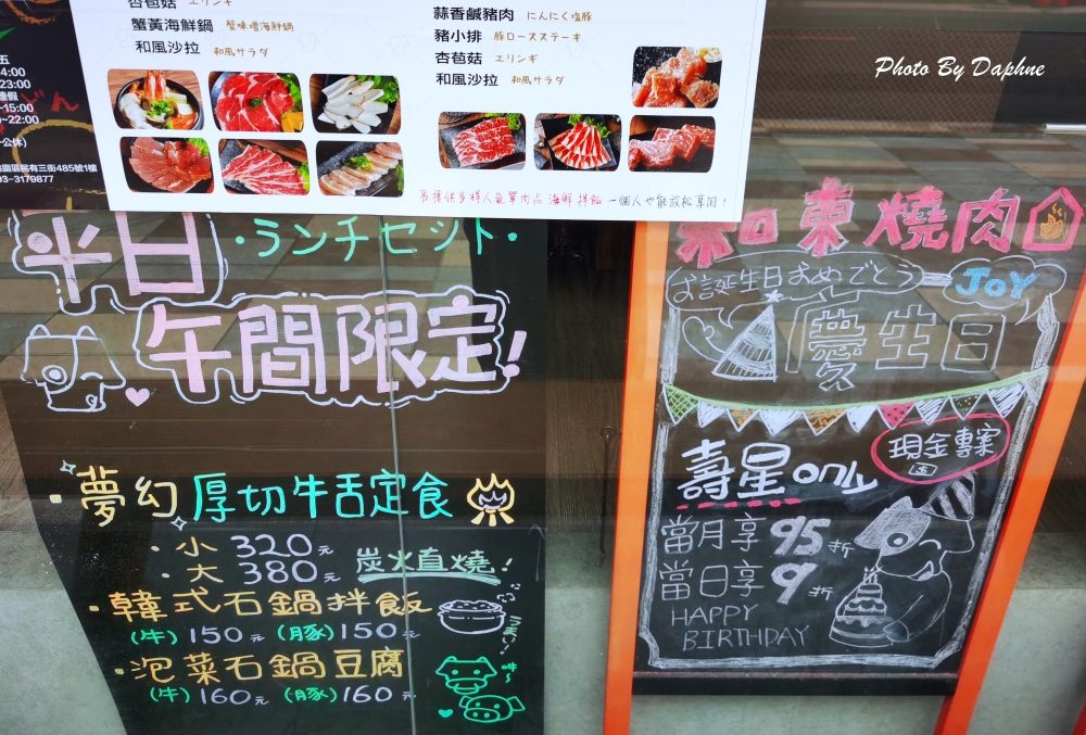 ▼平日中午有販售炭火直燒夢幻厚切牛舌定食、韓式石鍋拌飯、泡菜石鍋豆腐。想要吃個簡單料理的人有更多選擇。壽星優惠專案當日消費享95折優惠,當日消費享9折優惠也十分人性化。