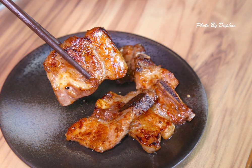 用醬汁先調味過的帶骨豬肉,烤熟之後,醬汁也被收進肉內,肥瘦恰當,骨肉皆甘甜,連肉帶骨頭部分,特別令人允指回味。