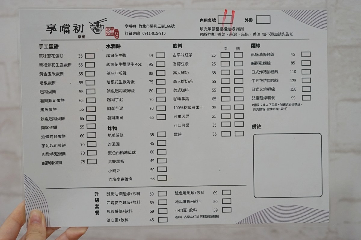 去的時候老闆說可能會改菜單,不知道現在改了沒有,這是我當時用餐的菜單。提供手工蛋餅、水潤餅、炸物還有享初食堂經典的麵線,老實說兩年前享初食堂在東門市場剛開的時候,我有去吃過鹹酥雞麵線,很特別的口味,鹹酥雞大塊又好吃,鮮蚵麵線的鮮蚵也是又大又肥美,的確是十分難忘的美味,但我一早起來還是想吃蛋餅的。