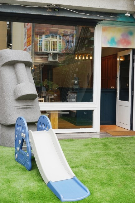 門口有超巨大的摩艾像還有小朋友可以玩的溜滑梯,鋪上草皮,還蠻可愛文青的。那天和拉傻一起去,我想到他家也是很多摩艾,問他要不要也搬一個回家,他翻我一個白眼,什麼意思啊~