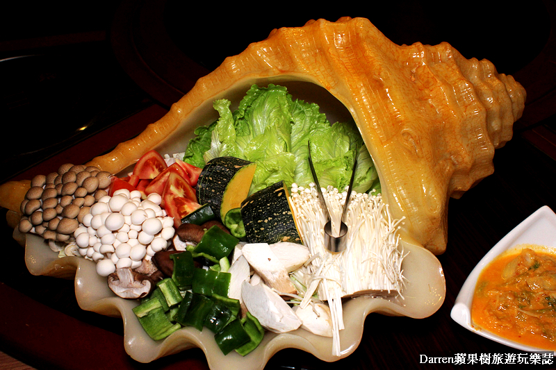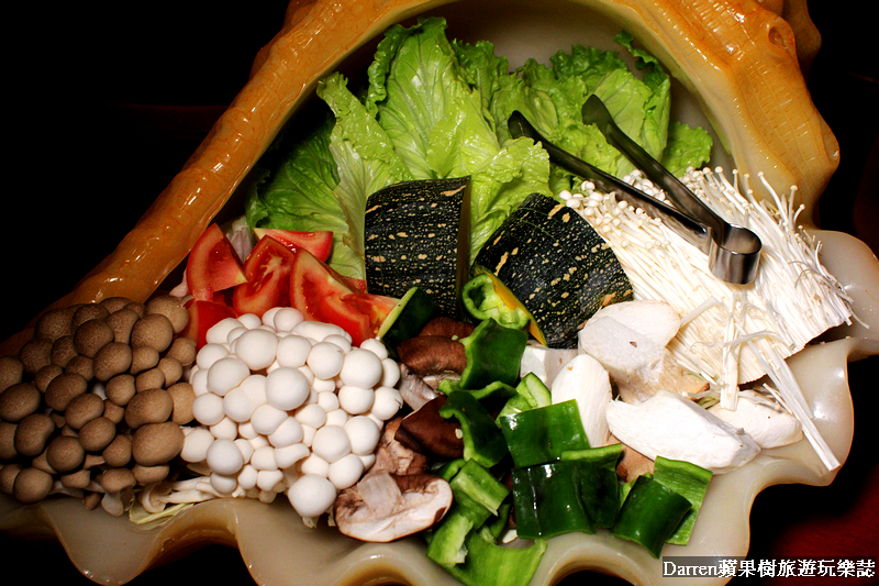 有機蔬果群菇盤,這根本就是升級版的基本菜盤,光是用巨大海螺造型器具盛裝整個就是霸氣外洩,菇類有香菇金珍菇鴻喜菇杏鮑菇等,蔬果有青椒、南瓜、蕃茄、青菜等,裡頭很深份量多到滿出來