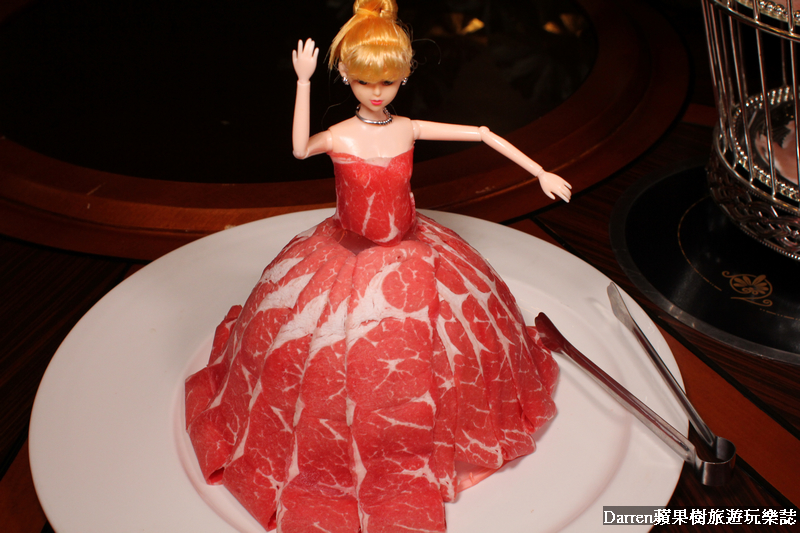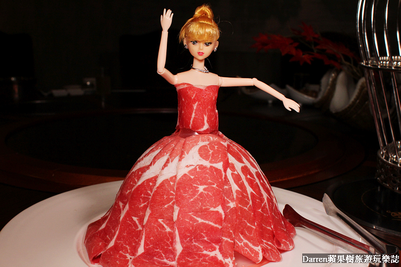 芭比娃娃肉盤一上桌讓人大開眼界,芭比娃娃的禮服變成肉片,我立馬聯想到Lady Gaga震驚全球的生肉裝,這真得有異曲同工的感覺,拿肉片來煮還要一片片夾起來,而且肉片的份量也比想像來得多