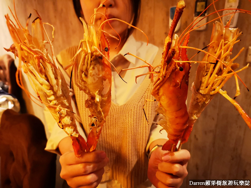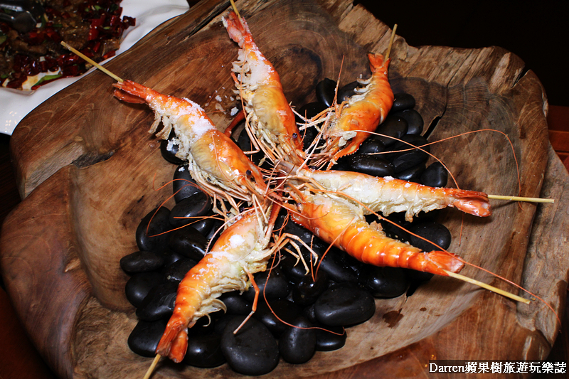 原木火燒泰國蝦又是個華麗桌邊秀!!!關上燈後現場點火現燒泰國蝦,這火一點沒多久包廂內就有烤蝦的味道散發出來