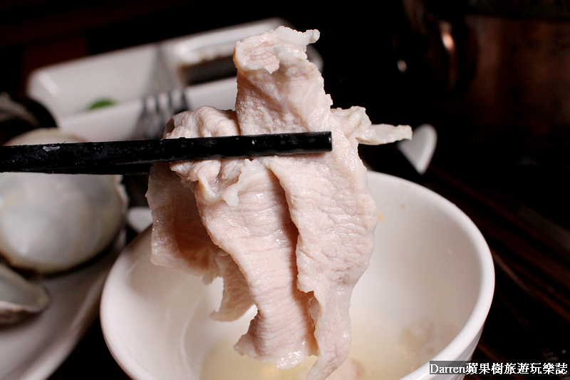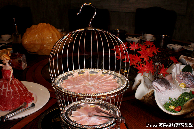 特選黃金6兩雪紋豬,雪紋豬又叫松阪豬肉,主要是指油脂如雪花般分佈,彷彿牛肉的大理石花紋,每頭豬只有兩片的松阪豬肉,白嫩肉色吃起來嫩中帶脆有嚼勁,又不會過硬以及不會有明顯的豬味,厚薄度剛好肉質甜美好吃,第一次看到裝盛肉盤的器具是鳥籠也非常特別